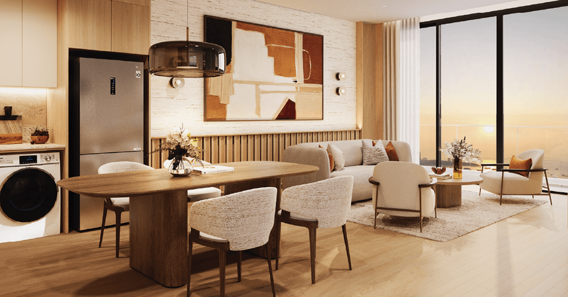 From flowing feature walls to sun-washed hues and natural stone textures, every detail is crafted to harmonize urban living with seaside serenity.